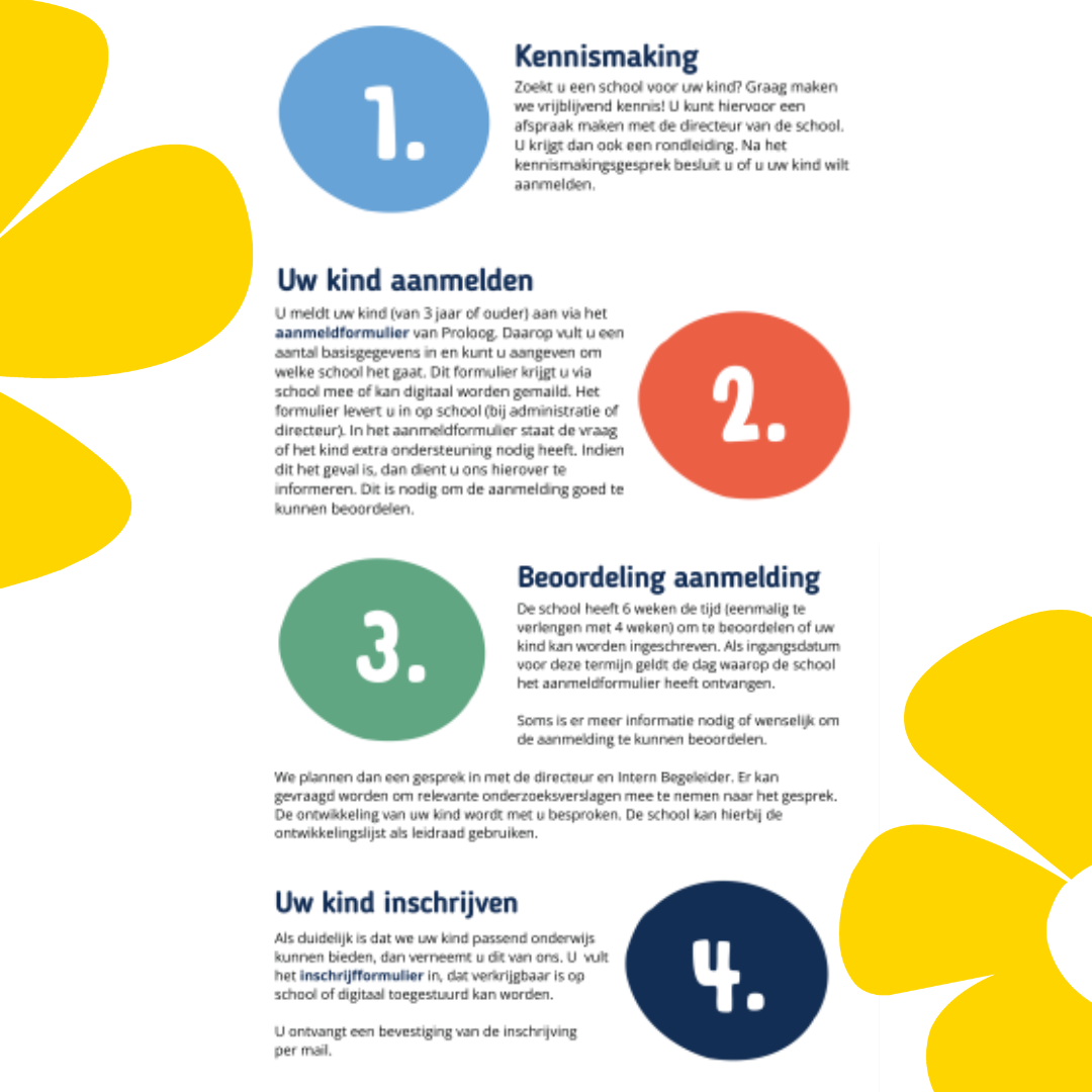 Uw kind kan vanaf 3 jaar worden aangemeld bij een school naar keuze. Het aanmeldformulier is verkrijgbaar bij de school (deze kan evt. ook digitaal gestuurd worden). Als blijkt dat wij uw kind passend onderwijs kunnen bieden, dan krijgt u van de school een inschrijffomulier.